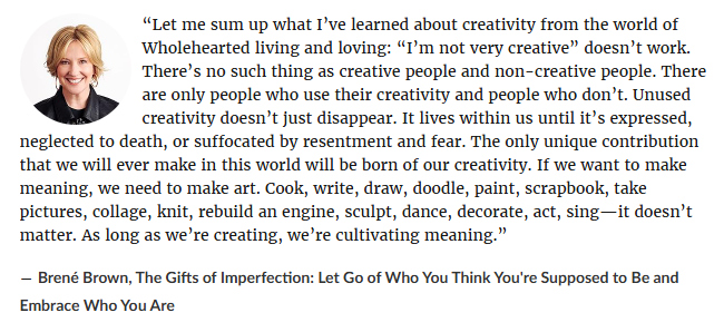 Art in all its expressions belongs to all of us. Brené Brown echoes this in The Gifts of Imperfection, reminding us that unused creativity doesn’t just disappear; it turns into grief. We are wired to make things. And art, even in its smallest form, is one of the most honest ways back to us.